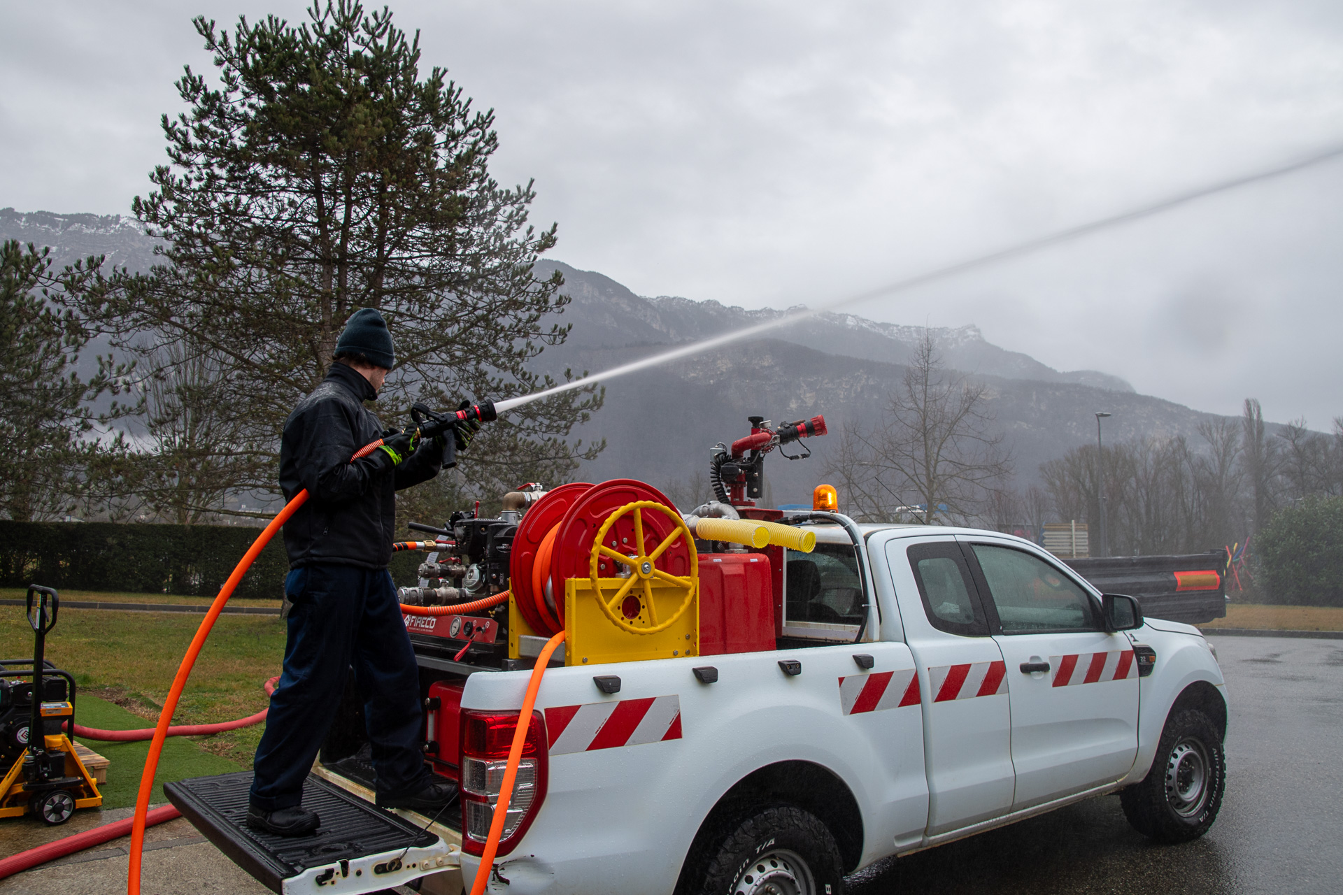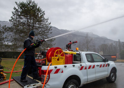 En option, nous proposons un canon motorisé de 300 l/min maximum avec une portée max de 35 mètres environ. Avec sa portée radiocommandée de 150 mètres, il permet une attaque de l’incendie tout en ayant une distance de sécurité.