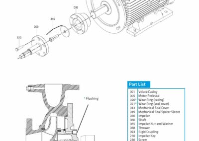 - Facilité de Démontage : grâce à la conception de l’extraction par l’arrière, l’ensemble du palier, y compris la roue et le couvercle du boîtier, peut être démonté sans retirer la volute du système de tuyauterie . La maintenance est simplifié.
