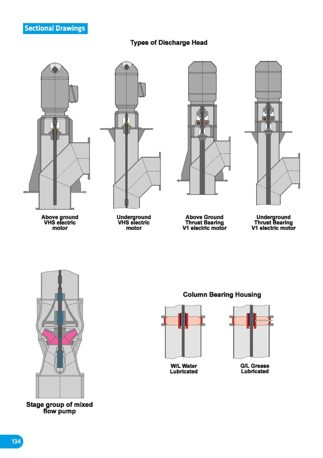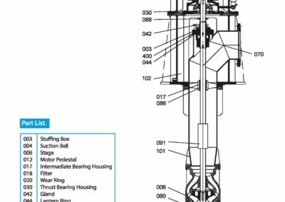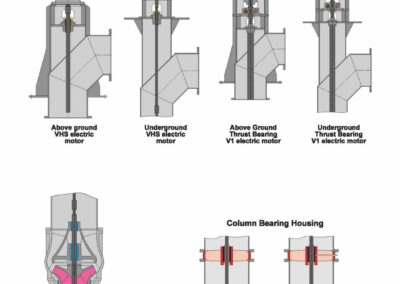- Les débits varient de 300 à 10 000 m³/h avec des hauteurs de refoulement pouvant atteindre 250 m. Des pompes de capacité plus importante peuvent être fabriquées sur commande spéciale.